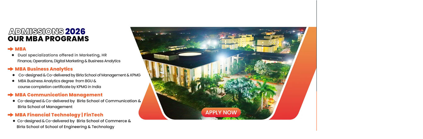 - MBAAbout The Program The Birla School of Management (BSoM), BGU, offers a 2-Year MBA built on rich knowledge capital to cultivate high-calibre leaders and entrepreneurs. As one of India's top B-Schools, BSoM ensures that its graduates are well-prepared for global business by utilising cutting-edge technology and an industry-integrated curriculum that includes mandatory internships and projects. Students obtain dual specialization in Marketing, Finance, HR, Operations, Digital Marketing, or Business Analytics. The rigorous program includes guest lectures and live projects to instil skills like multitasking and time management, positioning BSoM among the top private B-Schools in India. Program Objectives- To enhance the knowledge and skills of the students in different functional areas of management to work effectively in business & social organization